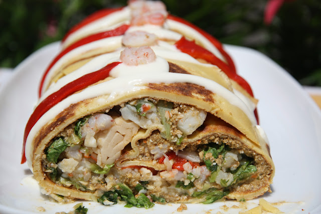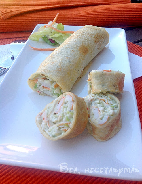Carolina, del blog Tomillo, laurel y otras cosas de comer, nos propone un Brazo de gitano de creps con verduras y marisco