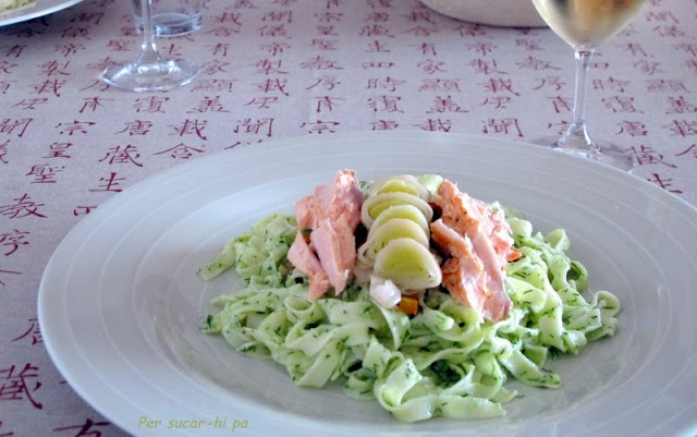 Pilar, del blog Per sucar-hi pa, nos propone unos Tallarines con salmón, puerro confitado y pesto de eneldo