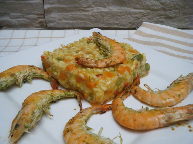 Carolina, del blog Tomillo, laurel y otras cosas de comer, nos propone un Risotto de verduras con langostinos al mojo verde