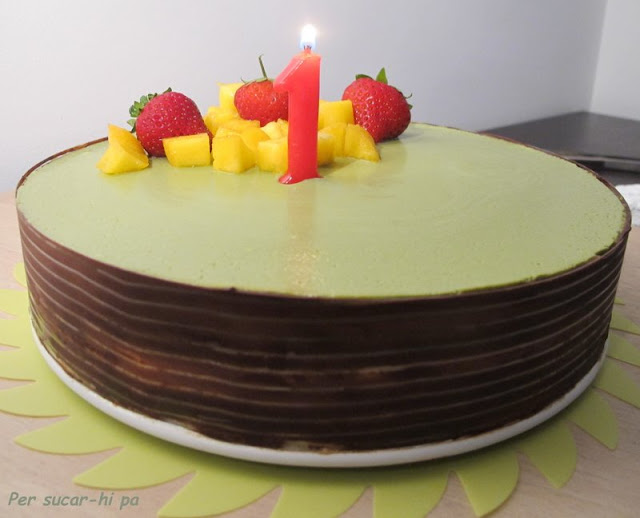Pilar, del blog Per sucar-hi pa, nos propone Tarta mousse de mango y té macha