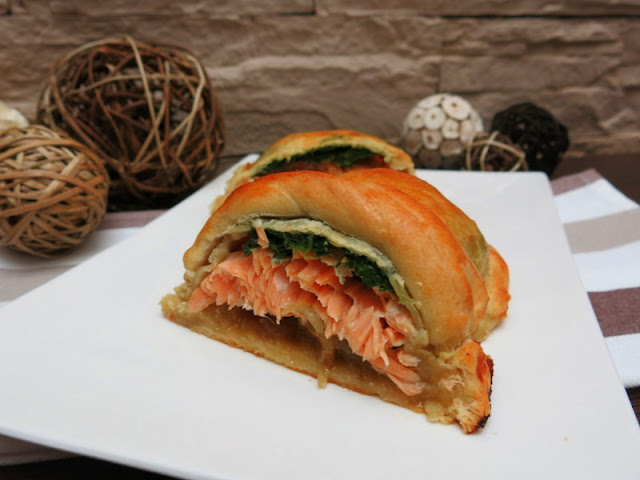 Alicia, del blog Con las manos en la masa. , nos propone un Kulibiak relleno de salmón y crema de espinacas